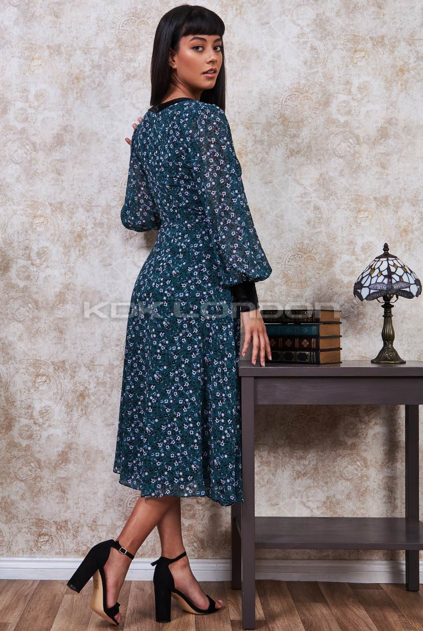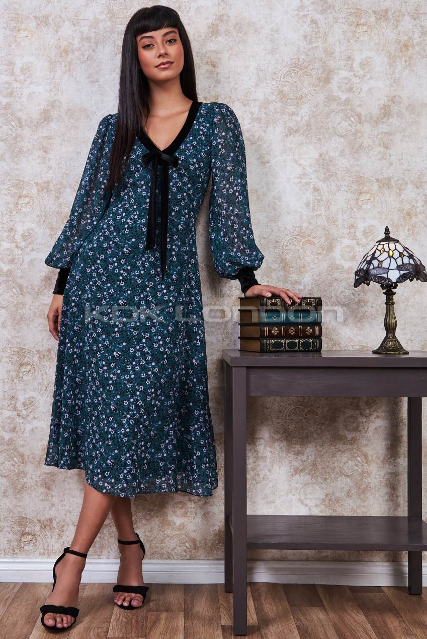 Emerald Printed Neck Tie Midi Dress