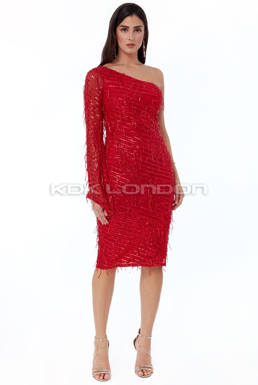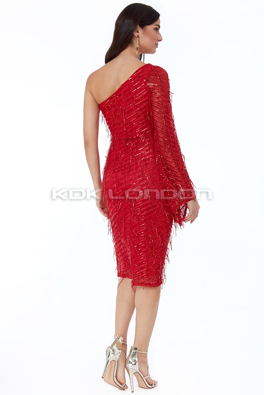 Red Asymmetric Flared Sleeve Sequin Midi Dress