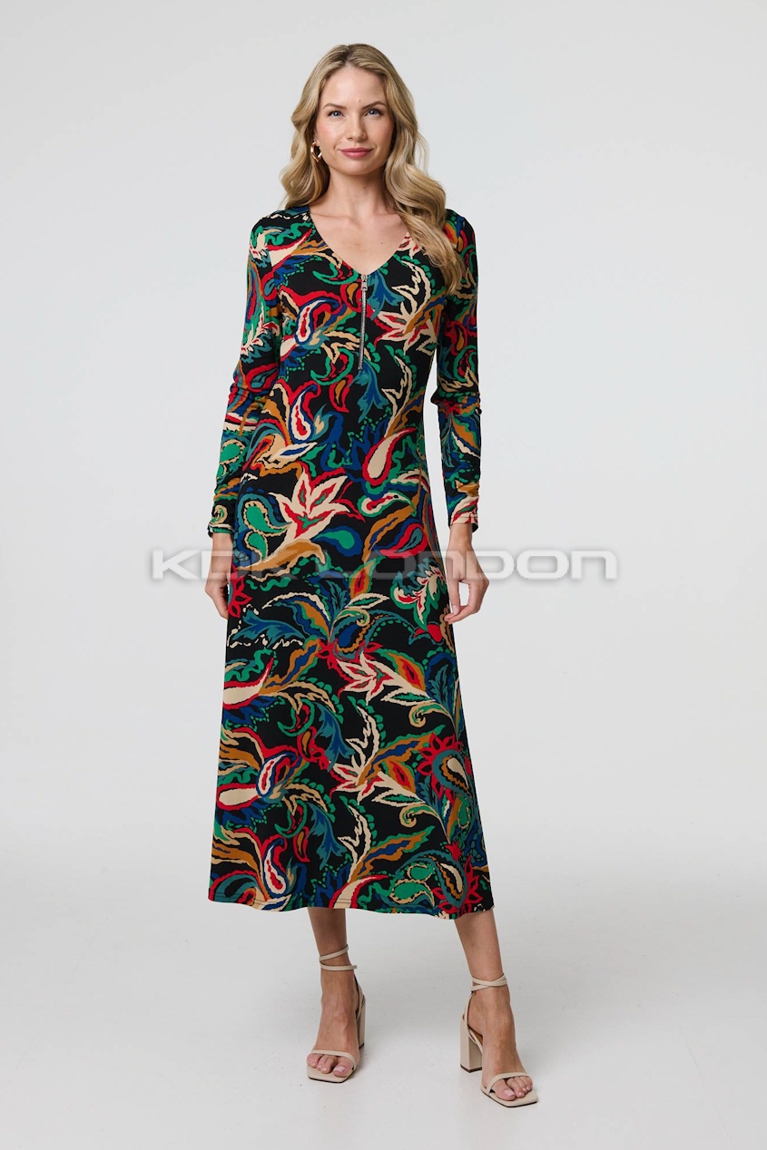 STELLA Black Long Sleeve Front Zip Midi Dress